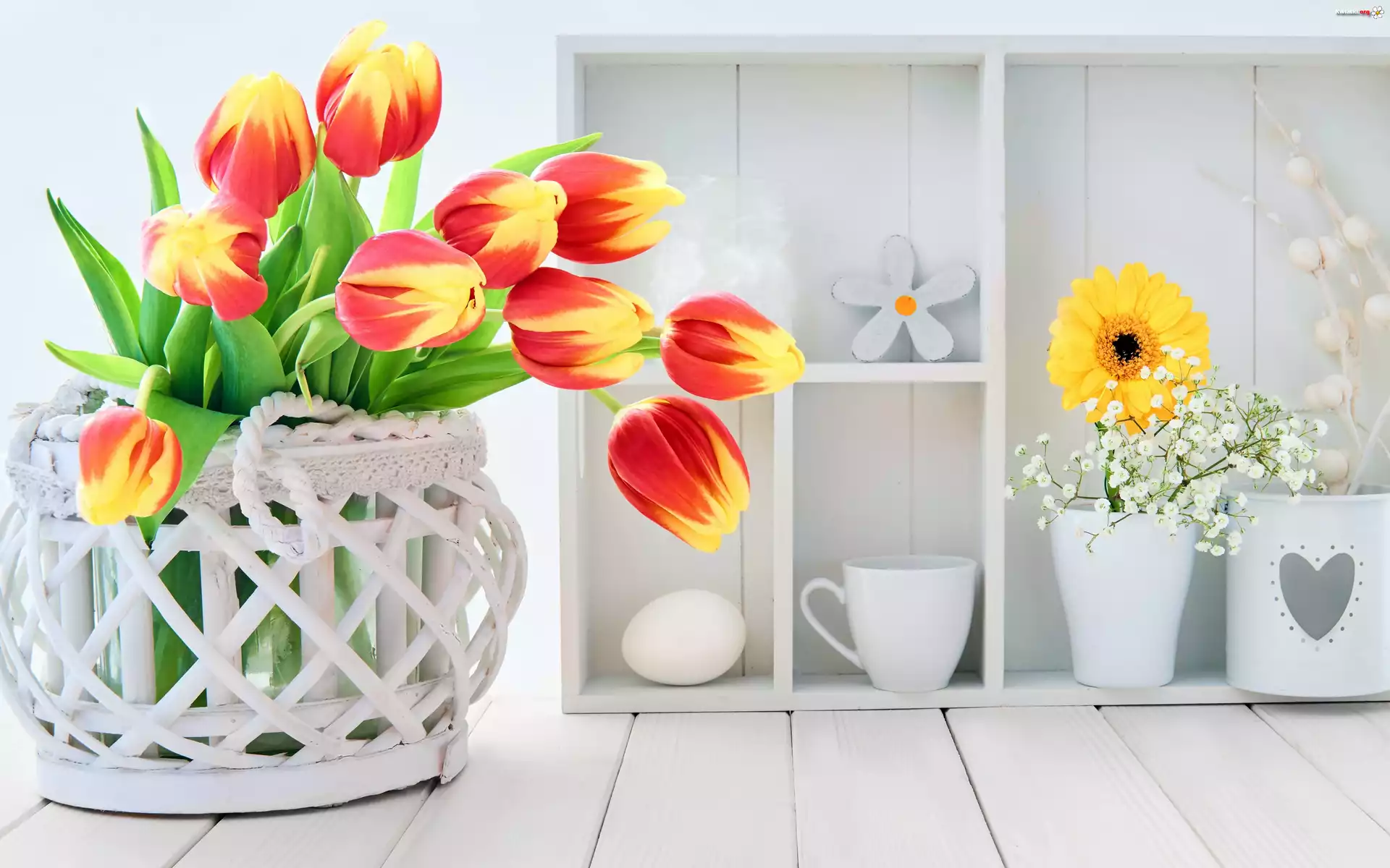 Kwiat Tulipany, Bukiet, Koszyczek, Półka, Kwiaty
