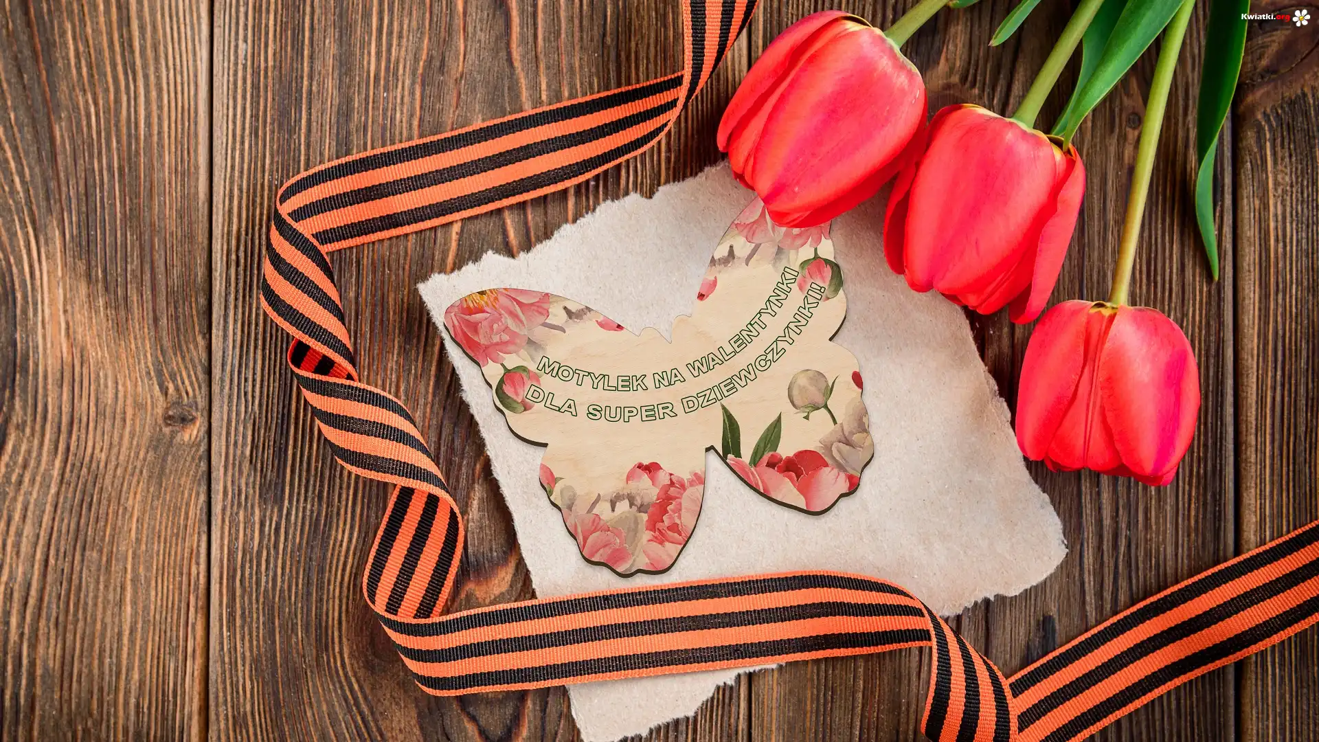 Kwiat Walentynki, Tulipany, Motylek, Kartka, Życzenia, Wstążka, Deski