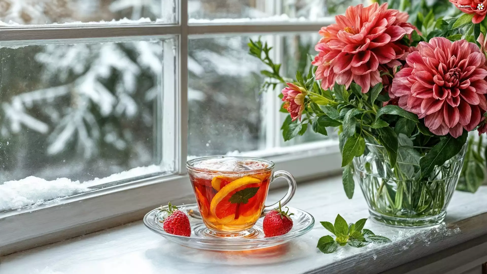 Filiżanka, Herbata, Truskawki, Wazon, Kwiaty, Dalie - Zdjęcia