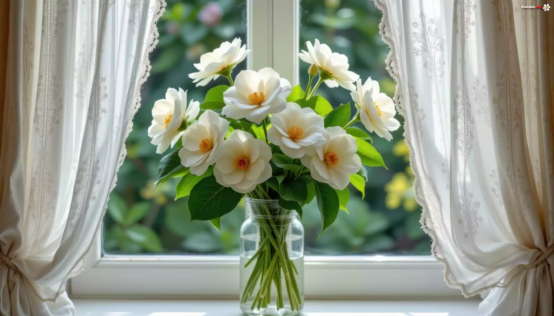 Kwiat Bukiet, Białe, Kwiaty, Wazon, Okno, Firanki