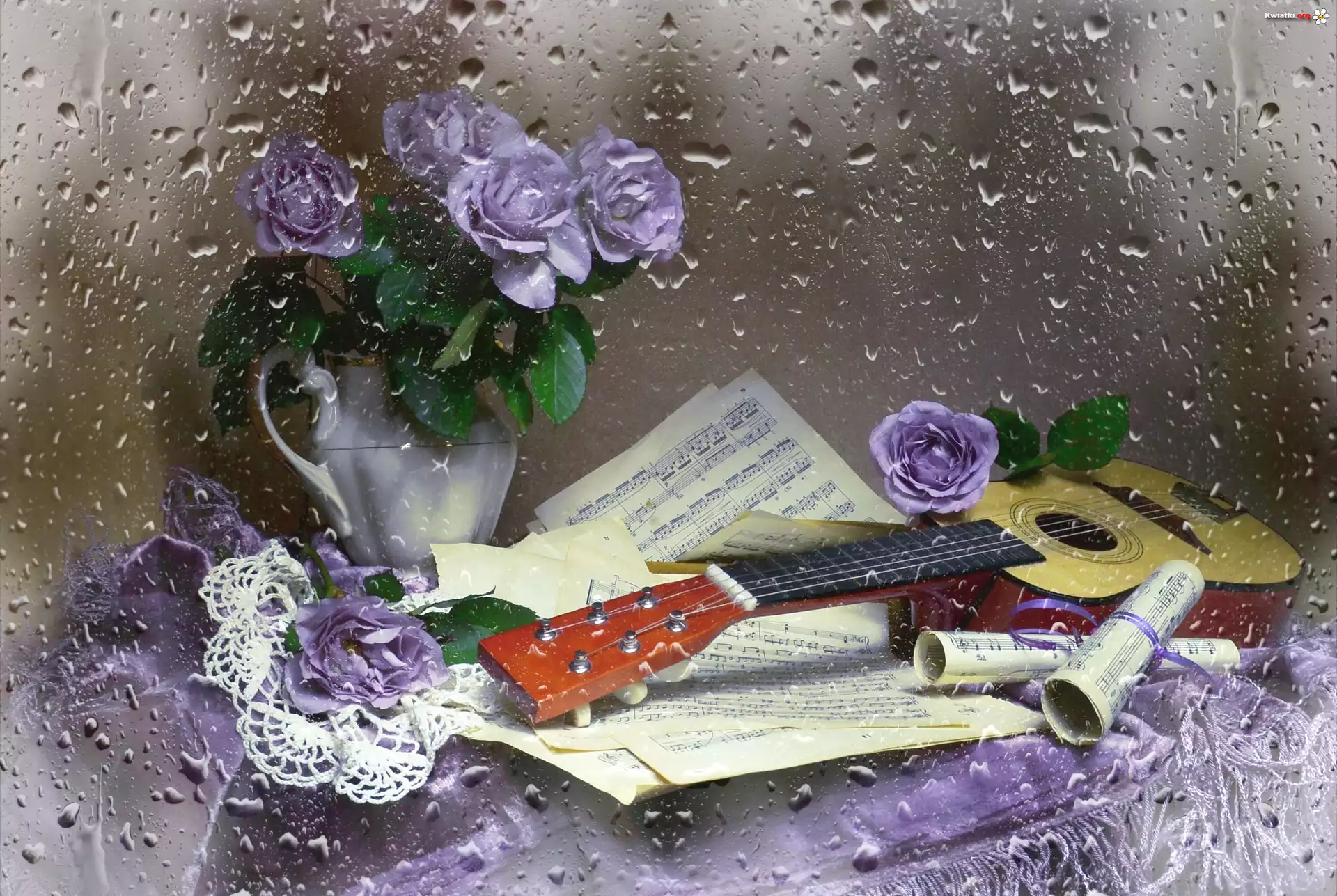 Kompozycja, Wazon, Bukiet, Róże, Gitara, Nuty, Krople - Zdjęcia