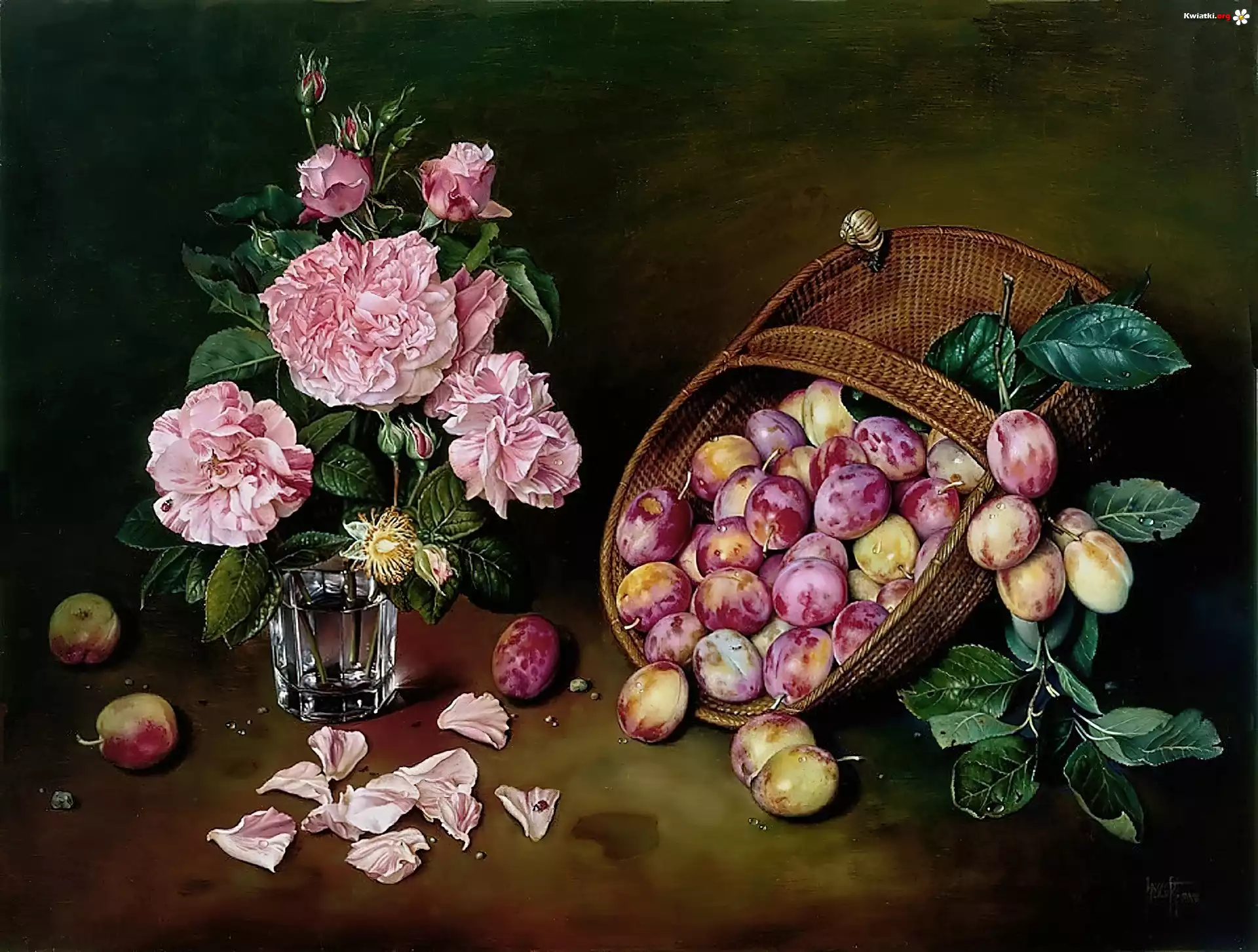 Wazon, Bukiet, Kwiaty, Kosz, Śliwki - Zdjęcia