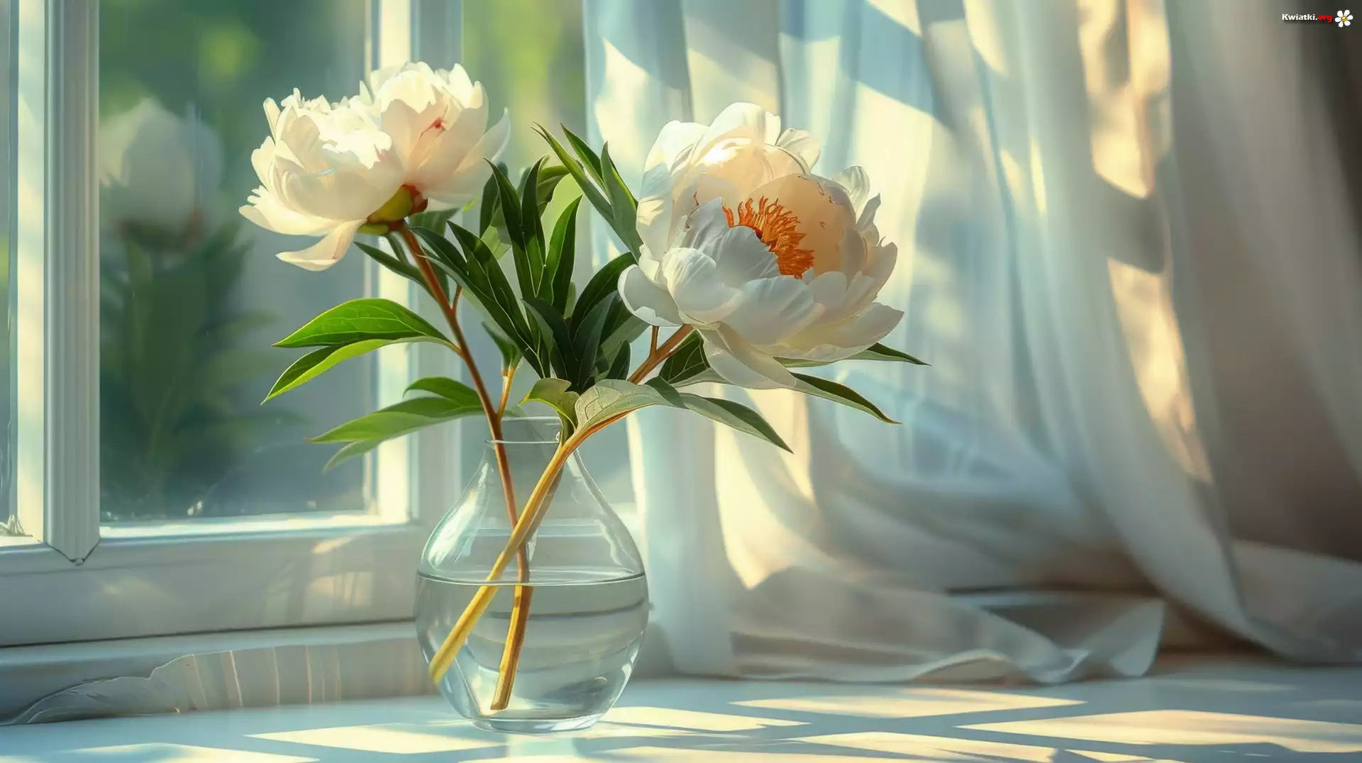 Kwiat Kwiaty, Białe, Piwonie, Wazon, Firanka, Okno