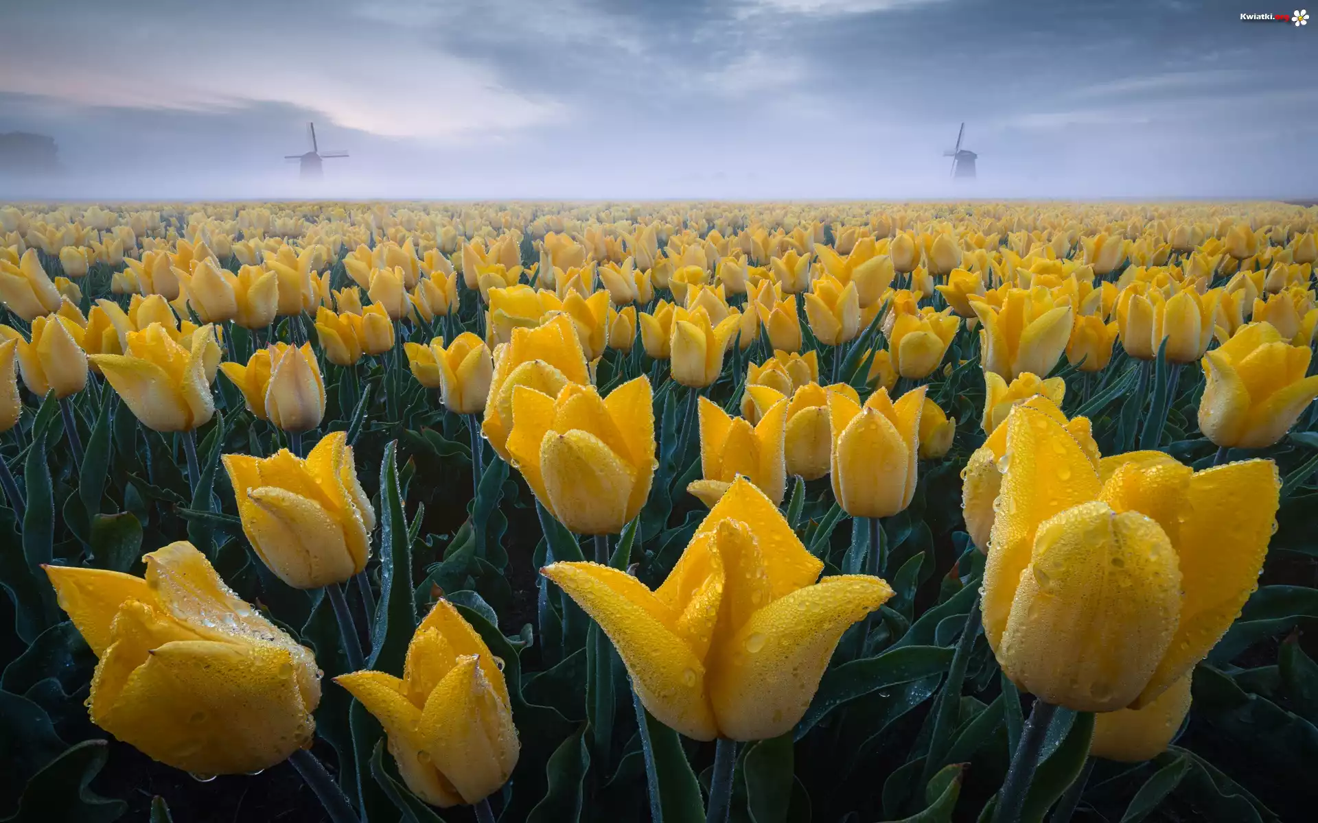 Pole, Plantacja, Żółte, Tulipany, Rosa, Krople, Mgła, Wiatraki - Zdjęcia