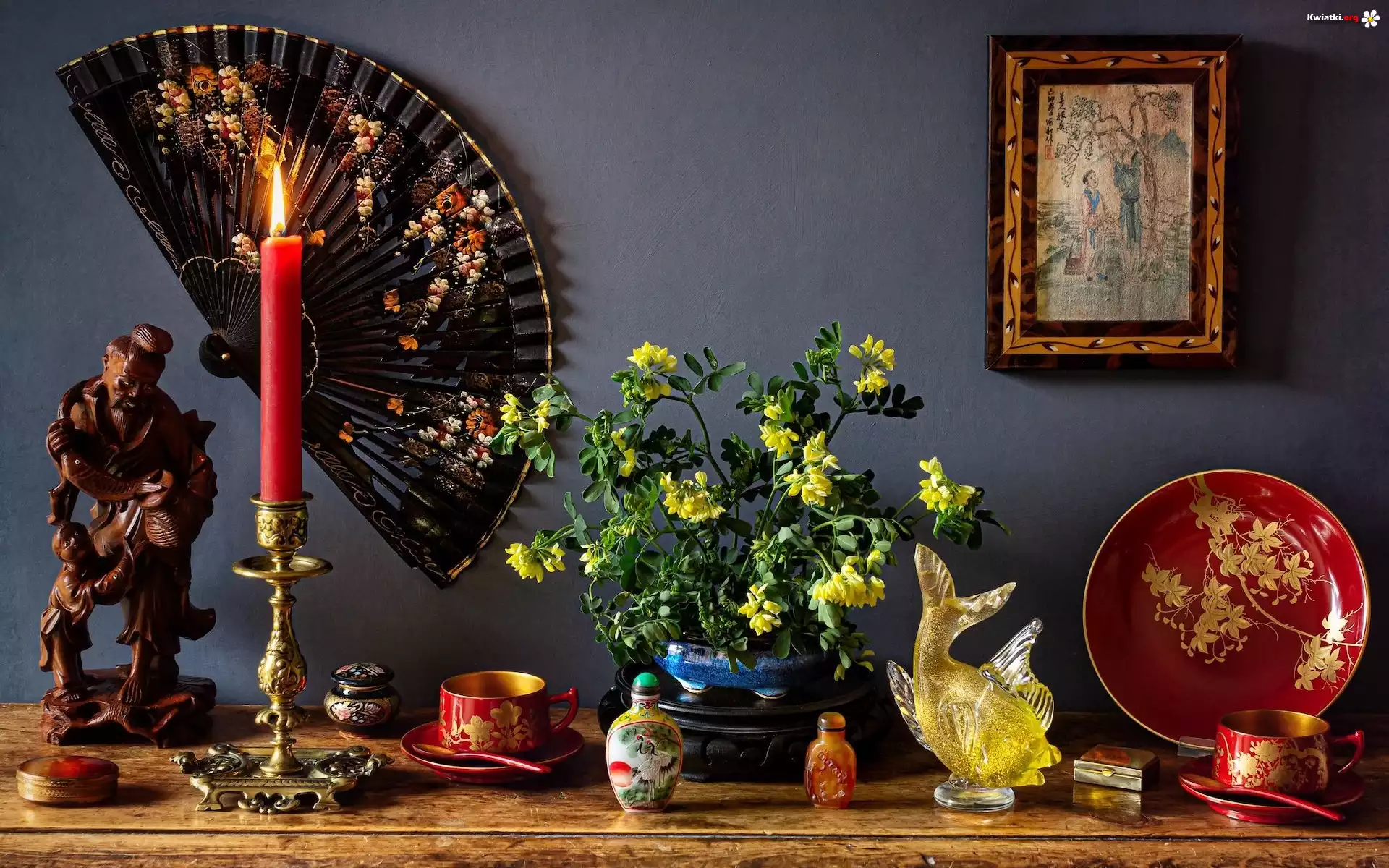 Kwiat Kompozycja, Świeca, Wachlarz, Figurka, Kwiaty, Cieciorki, Obrazek
