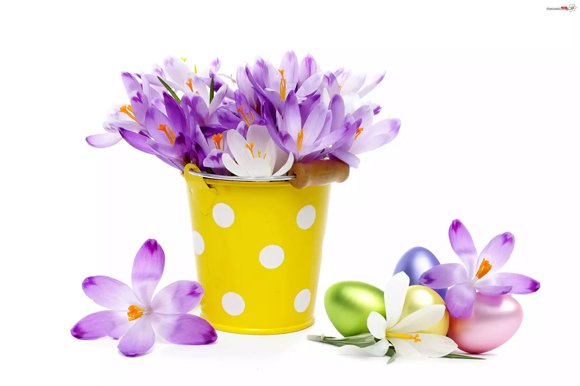 Wielkanoc, Kompozycja, Krokusy, Pisanki, Wiaderko - Zdjęcia