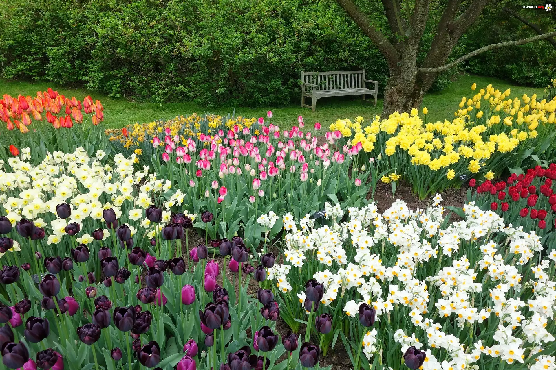 Wiosna, Park, Tulipany, Żonkile, Ławka, Drzewa - Zdjęcia