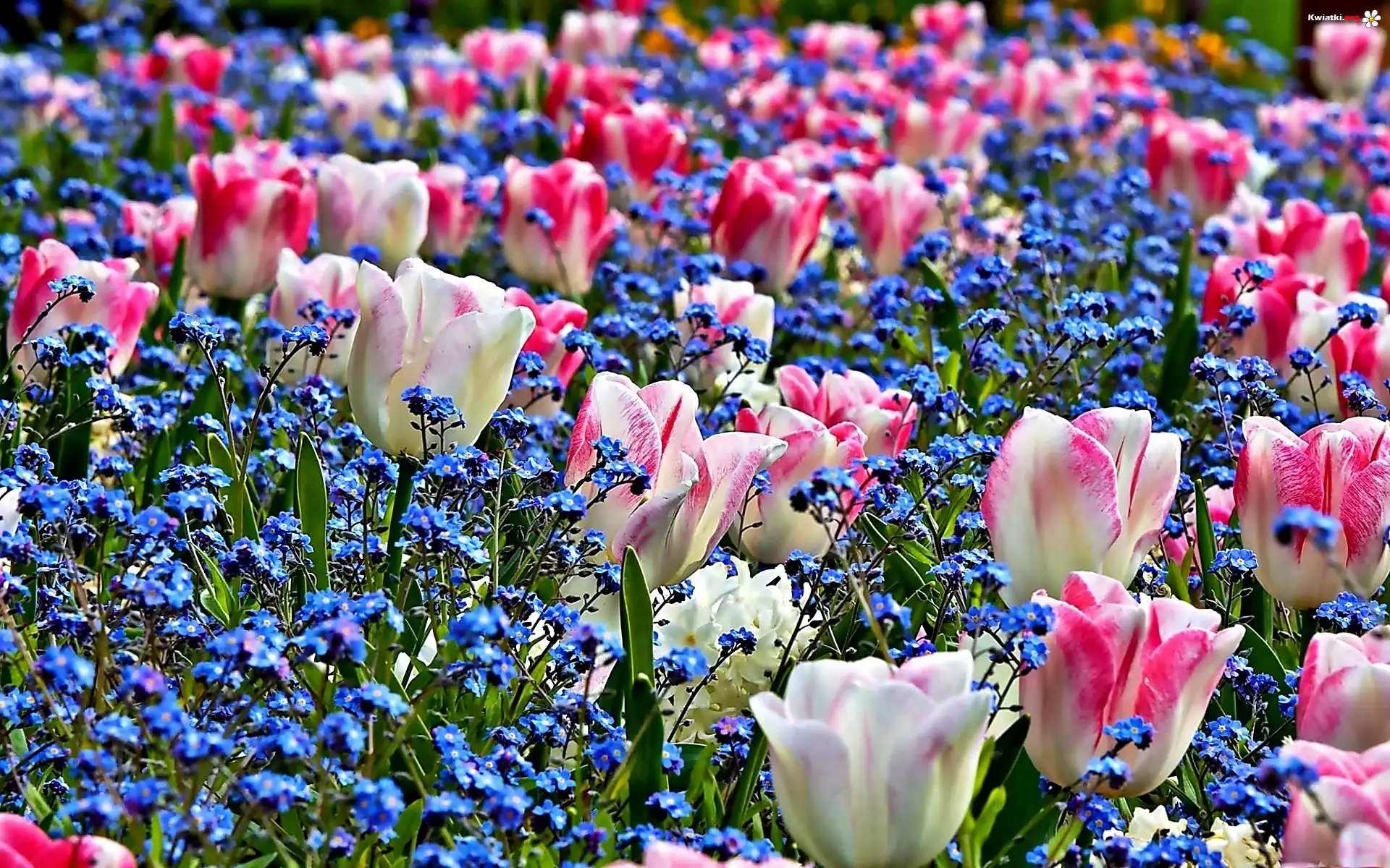Kwiat Wiosna, Ogród, Tulipany, Niezapominajki