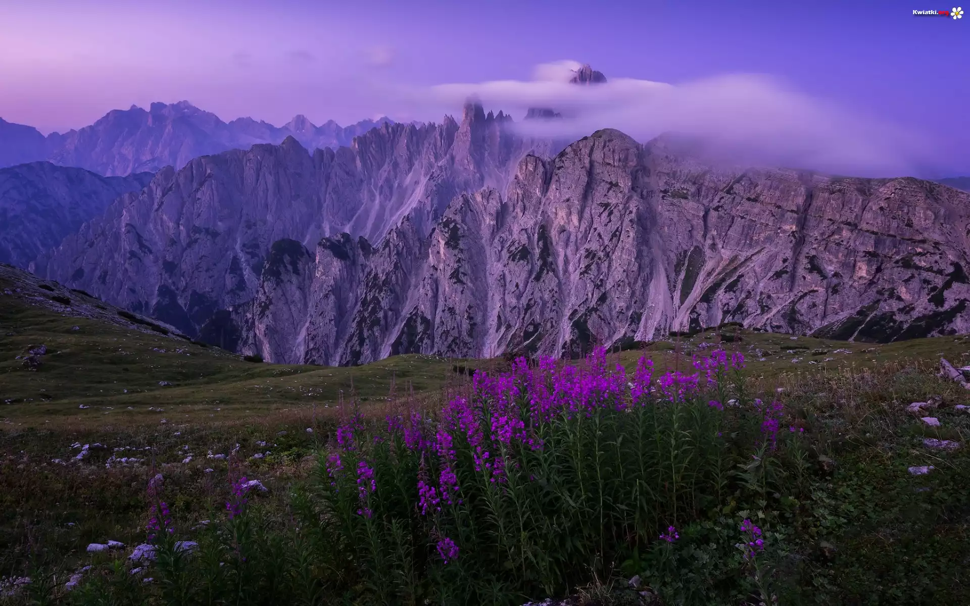 Włochy, Prowincja Belluno, Dolomity, Pasmo górskie Cadini di Misurina, Góry Alpy, Mgła, Fioletowe, Kwiaty, Krwawnica pospolita - Zdjęcia |