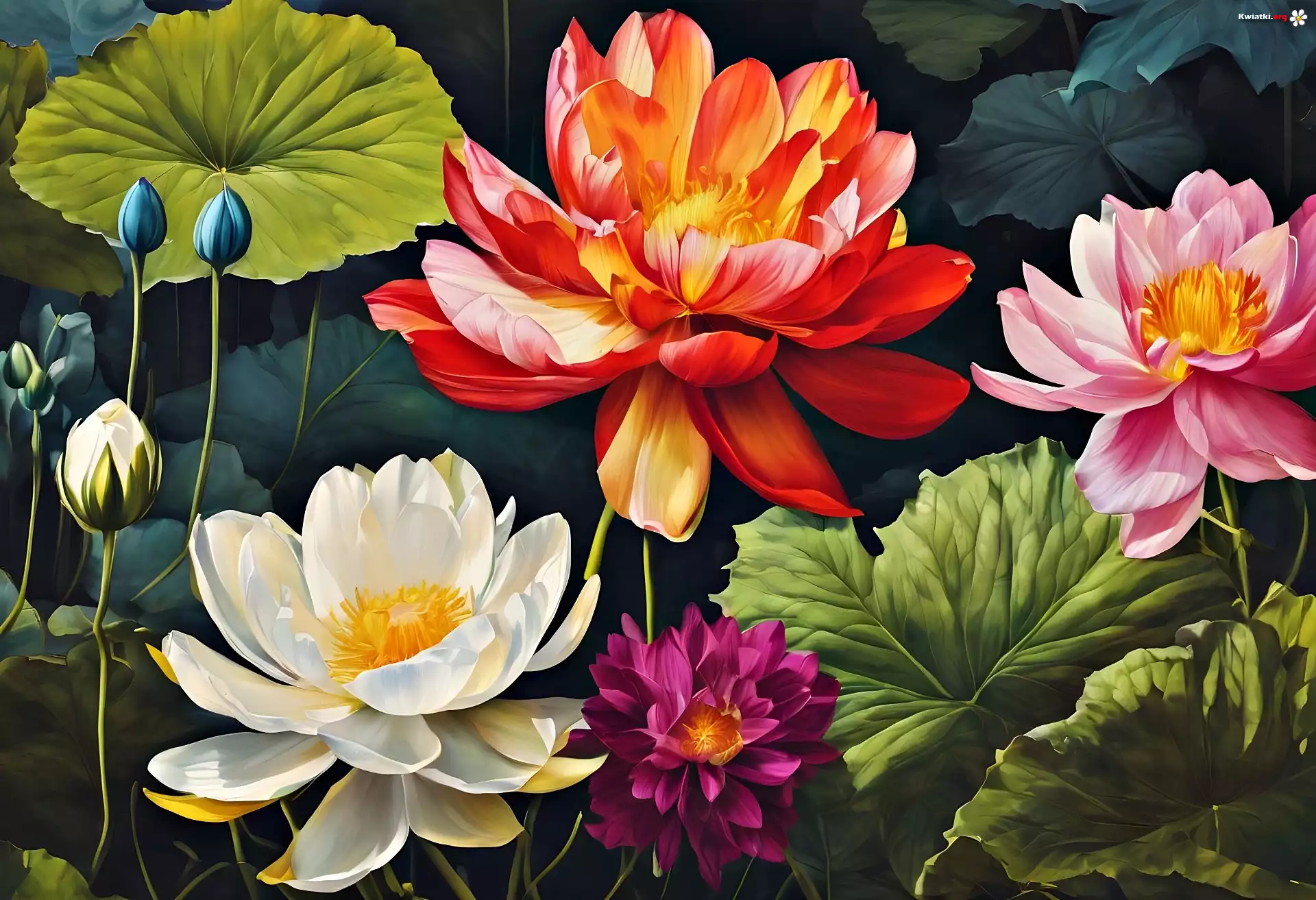 Kolorowe, Kwiaty, Lilie wodne, Liście, Pąki, Grafika - Zdjęcia