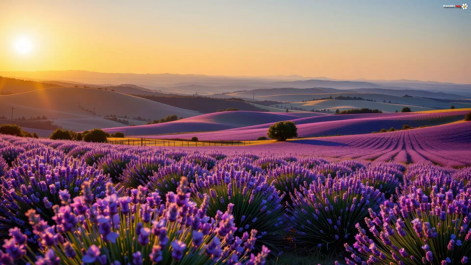 Kwiat Lawenda, Pole, Wzgórza, Wschód słońca, Drzewa, AI