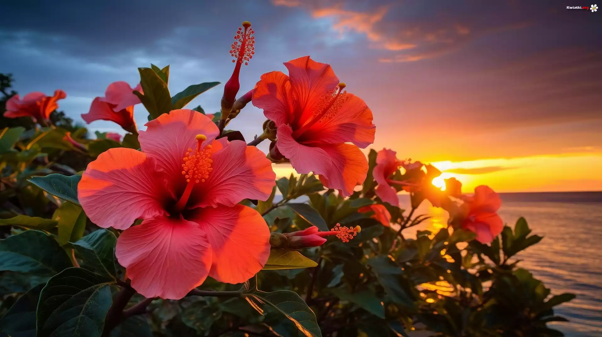 Hibiskusy, Kwiaty, Morze, Zachód słońca, Grafika - Zdjęcia
