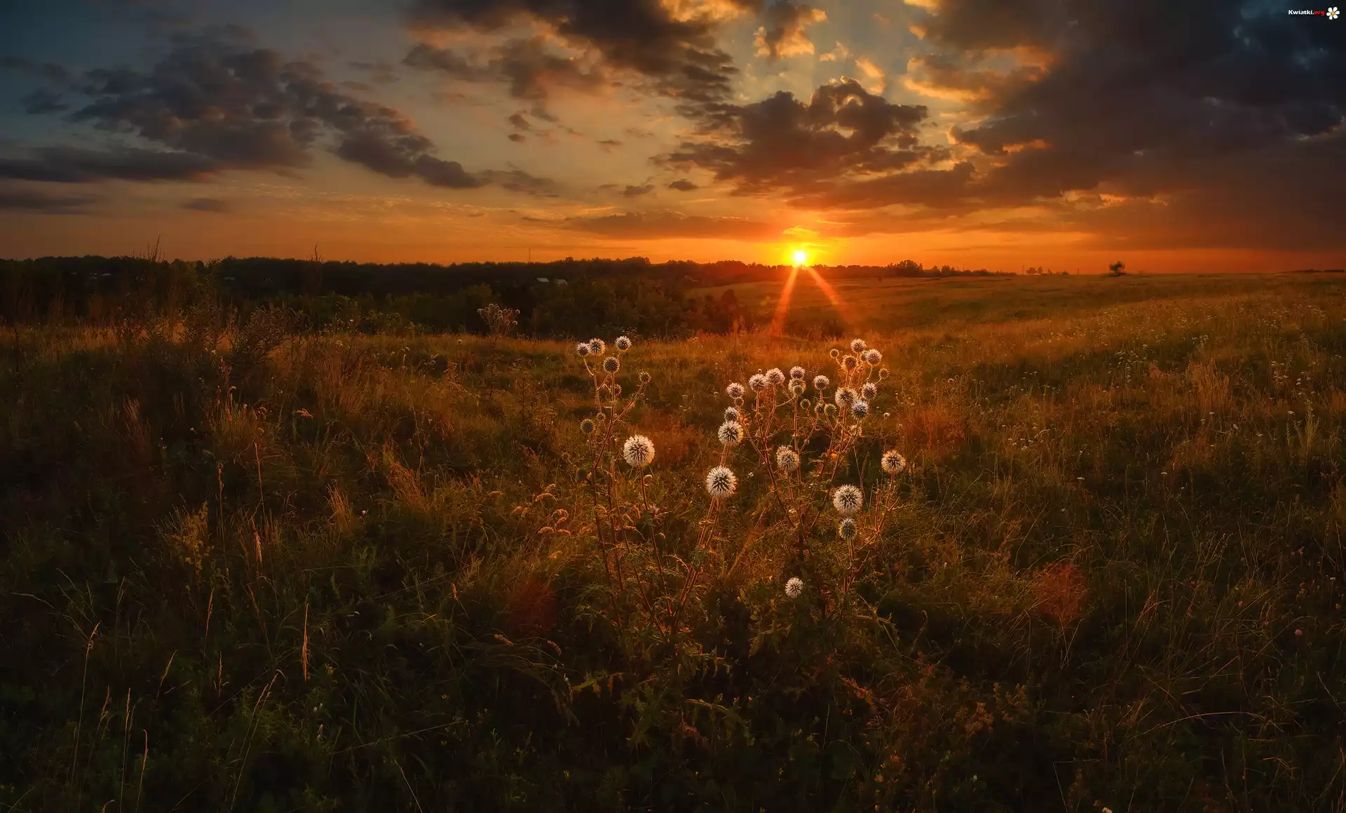 Zachód słońca, Łąki, Rośliny, Przegorzan kulisty - Zdjęcia