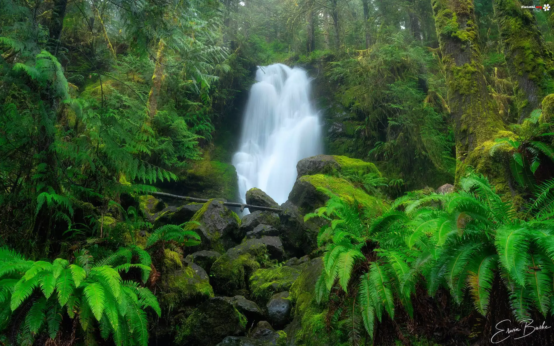 Las, Zielona, Roślinność, Drzewa, Paprocie, Wodospad, Kamienie - Zdjęcia