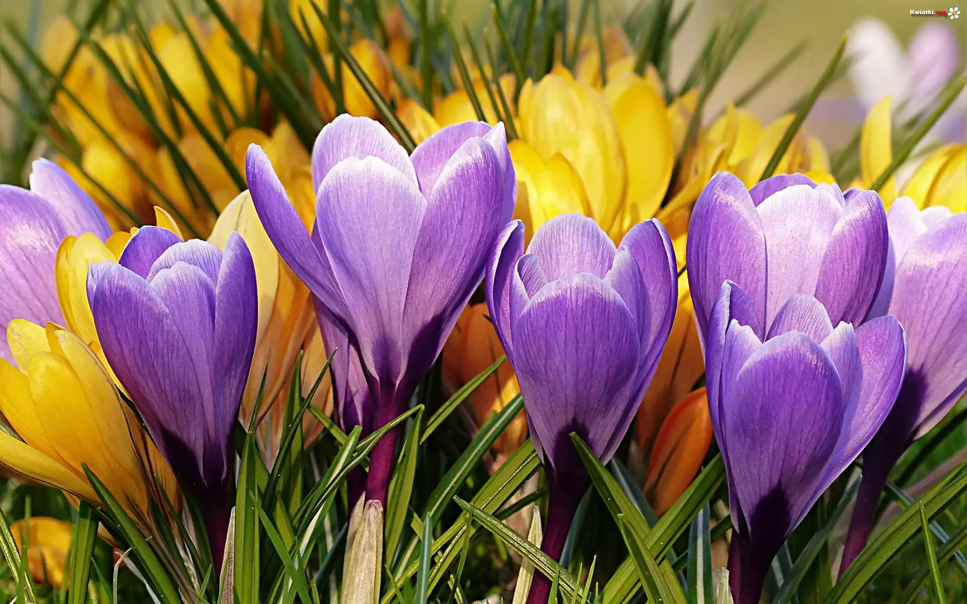 Kwiaty, Żółte, Fioletowe, Krokusy, Trawa - Zdjęcia