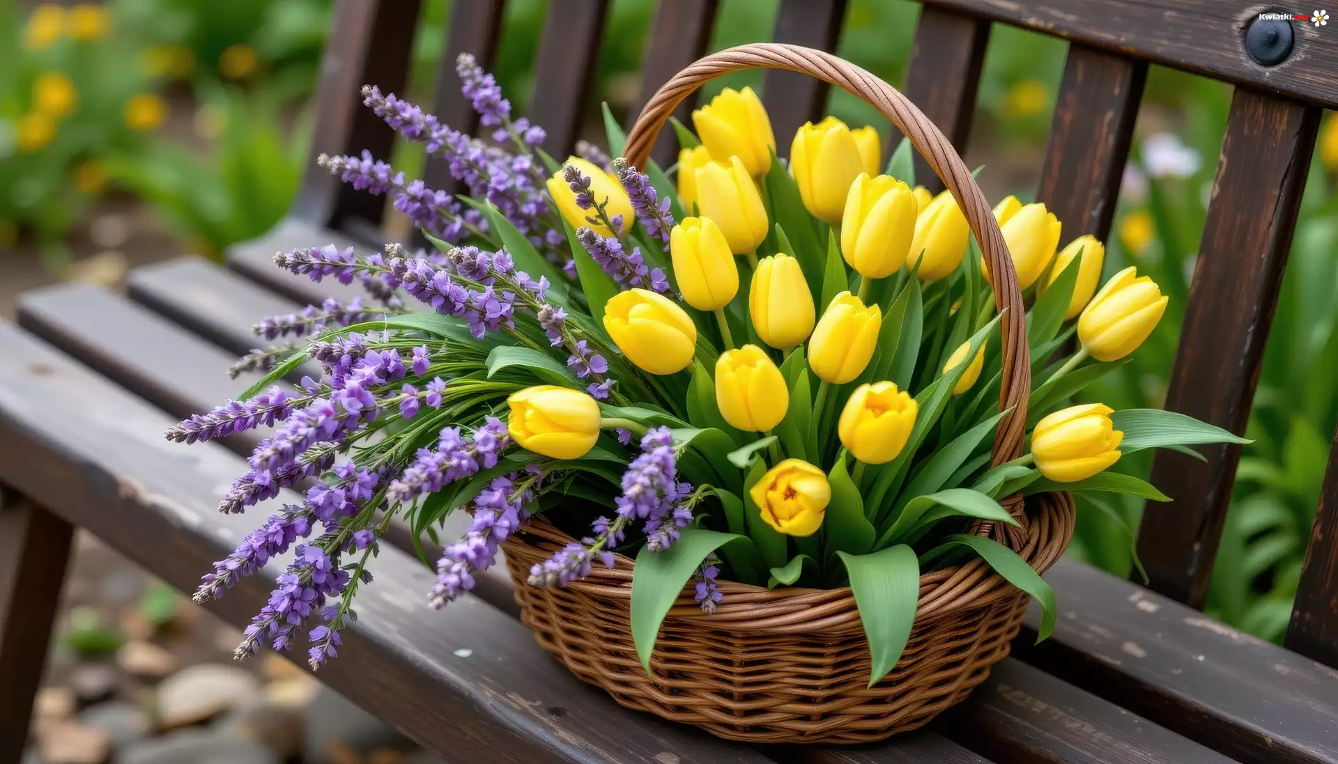 Wiklinowy, Koszyk, Kwiaty, Żółte, Tulipany, Lawenda, Ławka - Zdjęcia