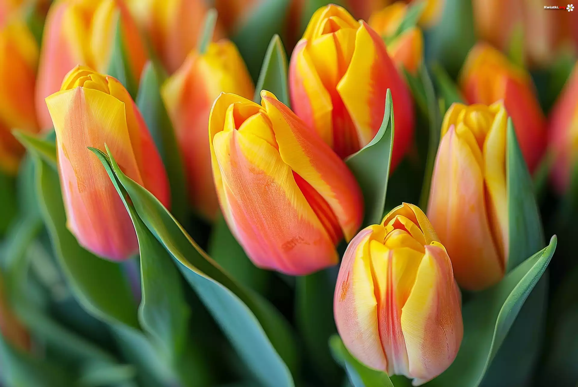 Tulipany, Żółto-czerwone, Liście, Zbliżenie - Zdjęcia