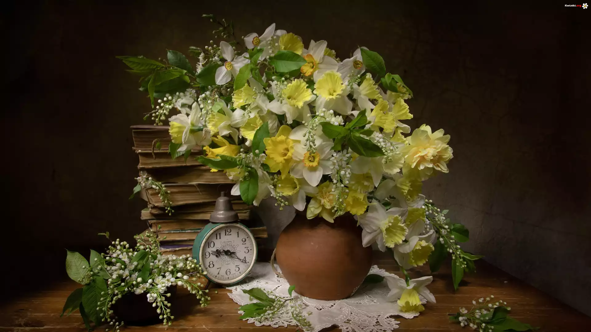 Książki, Budzik, Kwiaty, Żonkile, Wazon, Kompozycja - Zdjęcia